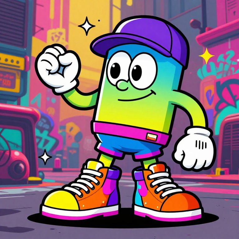 High top fade cartoon character with vibrant colors, exaggerated features, wearing retro 80s clothing, set against a graffiti urban background, dynamic style, bold outlines