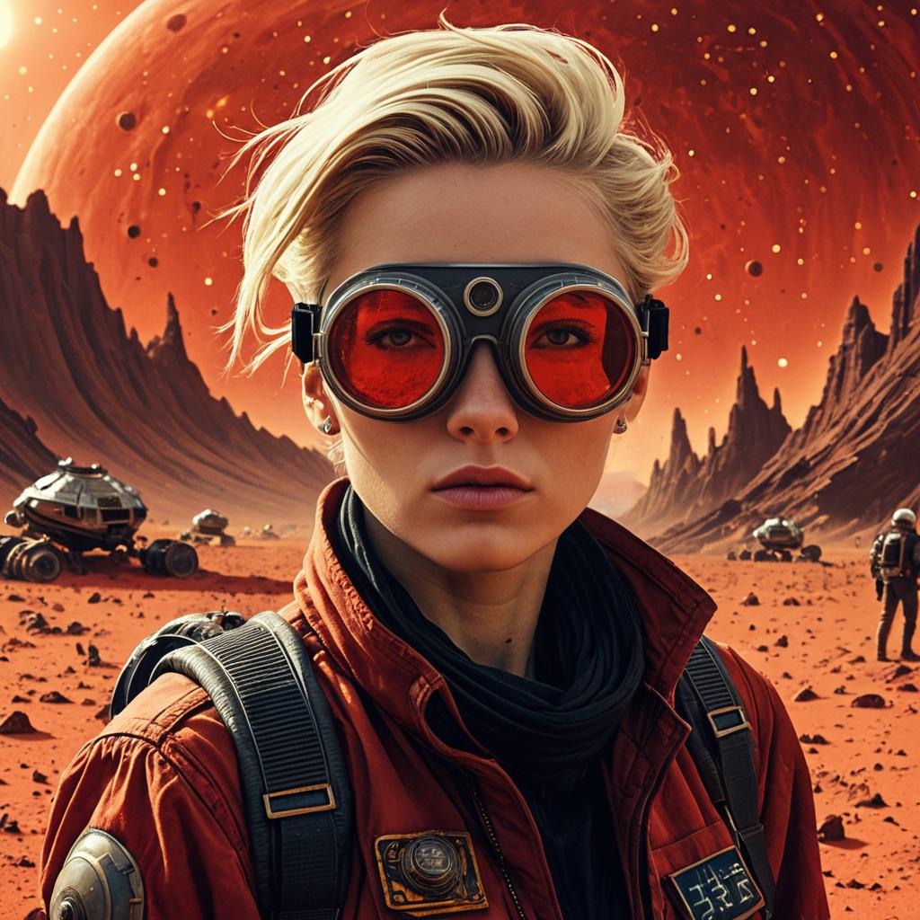 Close-up of a stoic, emotionless blond woman engineer wearing Victorian-style red goggles and an orange space suit with a black scarf. She stands on a dusty red alien landscape with rocky formations and multiple futuristic rover vehicles. The sky features a large red planet with nebula-like explosions, creating a hostile extraterrestrial atmosphere.