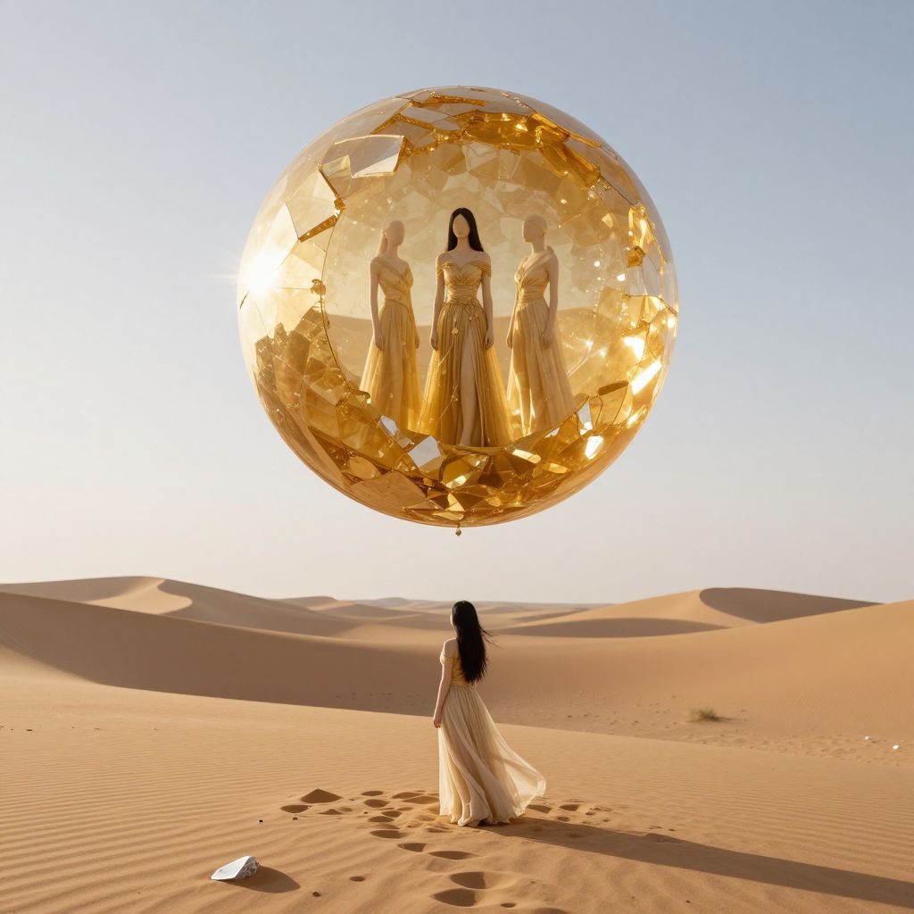 Silent figures stand within a golden crystal sphere hovering above a vast desert landscape, mirroring the solitary form of a woman in flowing attire below, surrounded by scattered sand and distant dunes under a serene sky.