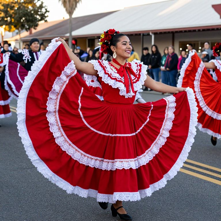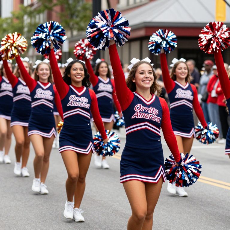 Cheerleaders in navy-blue and red uniforms emblazoned with \"Orrite America\" march energetically down a city street, waving and smiling as they prepare for Thursday's parade.