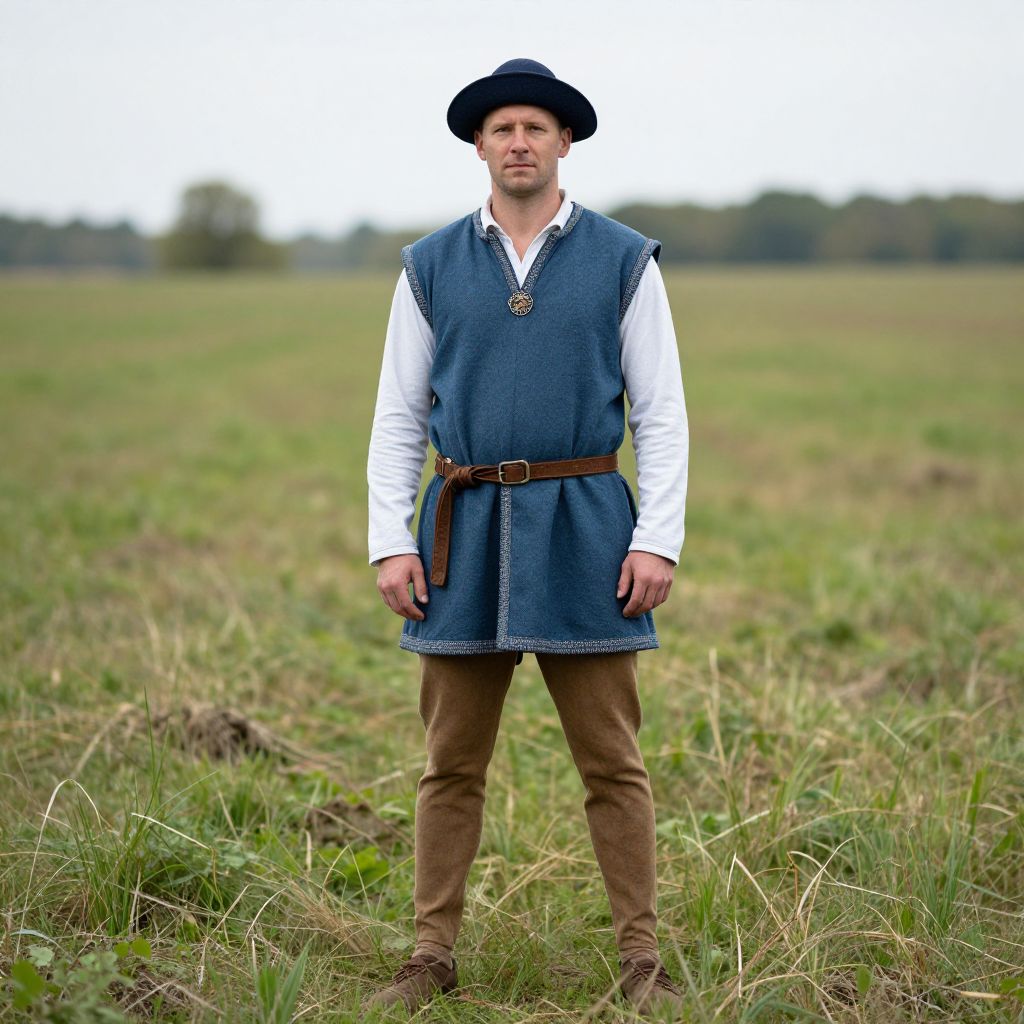 Medieval farmer costume, man in a blue vest and hat standing in a field