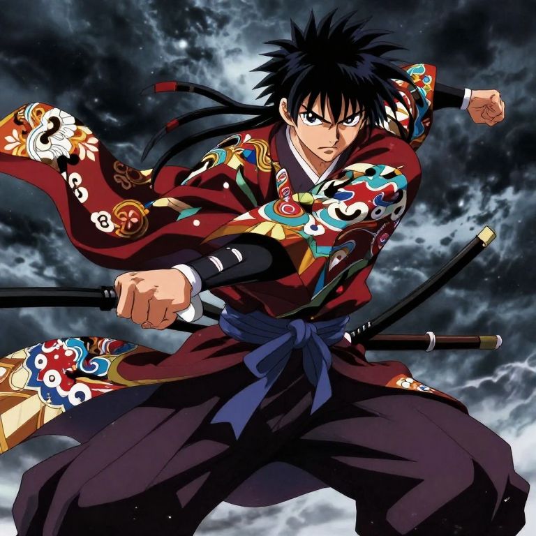 Anime photo generator ai rendering a dramatic action shot of a samurai anime warrior mid-battle, flowing robes with intricate patterns, intense expression, dynamic pose, dark stormy sky background, vivid colors and high contrast shadows