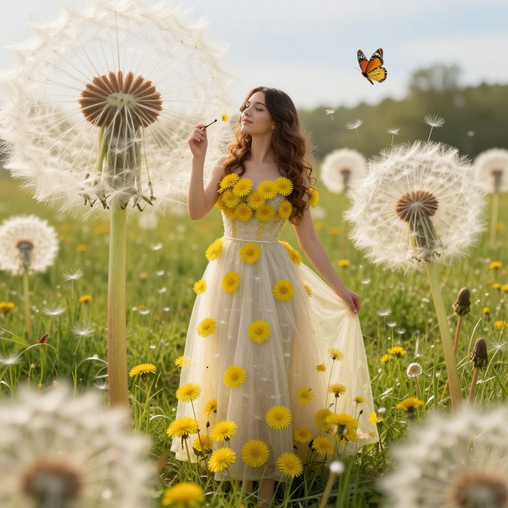 A woman in a dress adorned with dandelions stands in a field of giant dandelions, surrounded by seeds and butterflies, bathed in sweet daylight.