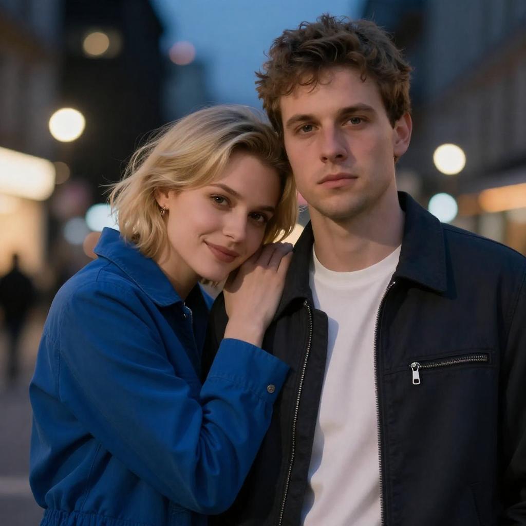 Photograph of a man and woman standing on a cobblestone path by a river. The woman with light brown hair, wearing a beige coat and holding a camera, looks intently at the camera. The man with dark brown hair, wearing a gray denim jacket and dark pants, stands beside her, smiling slightly. Background features a stone bridge with multiple arches. Both are on the left side, river on the right. Overcast sky.