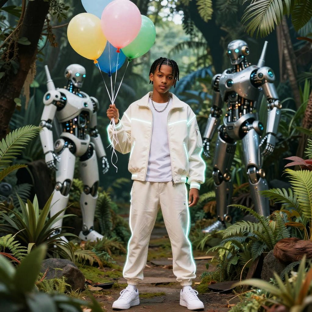 Afrofuturism boy with cornrows, holding helium balloons, dressed in light-up streetwear jacket and joggers, robotic jungle backdrop.