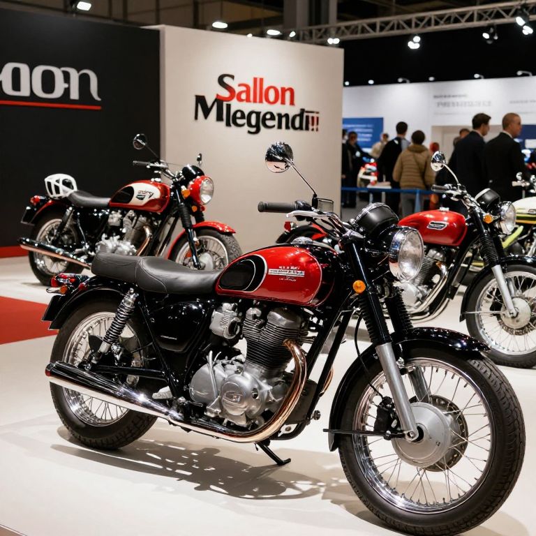 Classic motorcycles gleam under showroom lights at the Salon Moto Legende 2013 in Paris Vincennes, showcasing a vibrant display of vintage two-wheelers with polished chrome, sleek black finishes, and distinctive red accents.