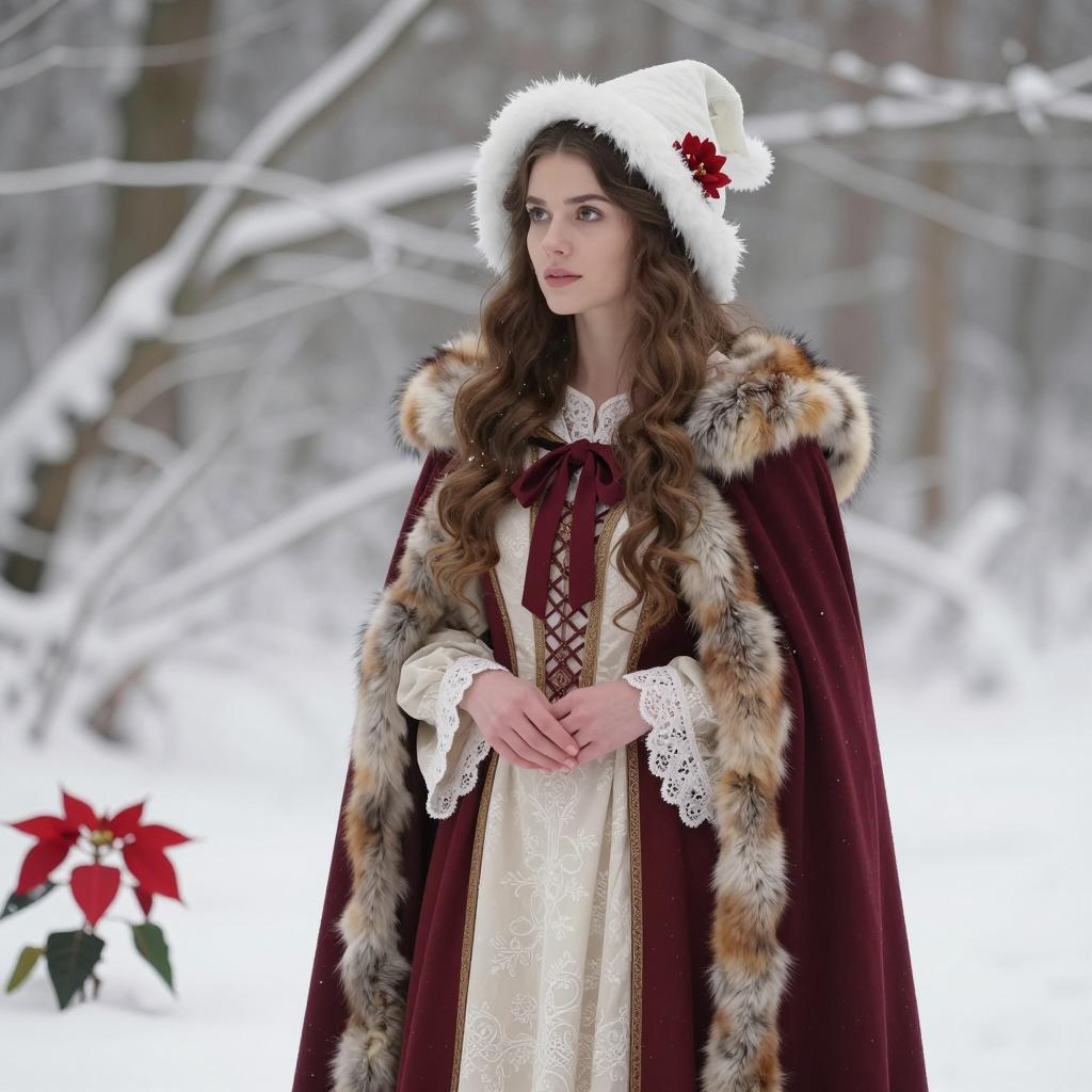 Snow witch costume, photorealistic, young woman, long wavy brown hair, wearing medieval-style winter cloak with fur trim, white hat with red flower, cream and burgundy dress with intricate lace, standing in snowy outdoor setting, background with snow-covered plants, red poinsettia on the ground, daytime, winter, serene expression, detailed ures, natural light, soft focus, standing pose, hands gently clasped, realistic, fantasy-inspired, winter clothing, traditional dress, medieval fashion, snowy environment