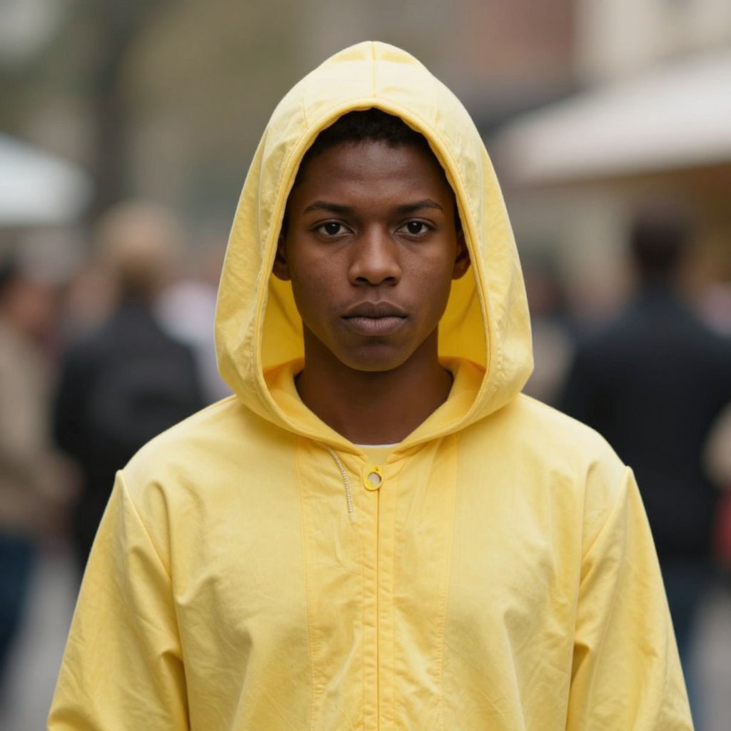 Bananaman fancy costume, 1boy, male focus, solo, realistic, hood, dark skin, looking at viewer, blurry background