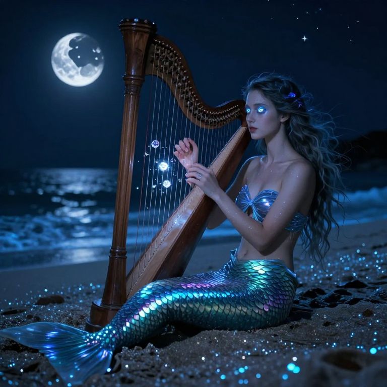 A mystical mermaid figure with shimmering scales reclines on a beach of bioluminescent sand. Her eyes mirror the fragmented glass moon above as she gently plucks celestial debris-crafted harp strings, weaving an enchanting melody that resonates across the cosmos. The ethereal portrait captures her serene expression, exuding both allure and melancholy, evoking emotions from admiration to introspection.