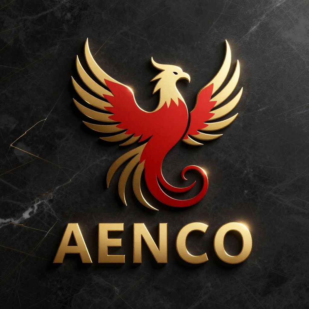 Red gold logo with a minimalist phoenix rising design, shimmering metal finish catching light from multiple angles, placed on sleek dark marble background, bold and clean typography below, artistic use of highlights and shadows giving depth and elegance.