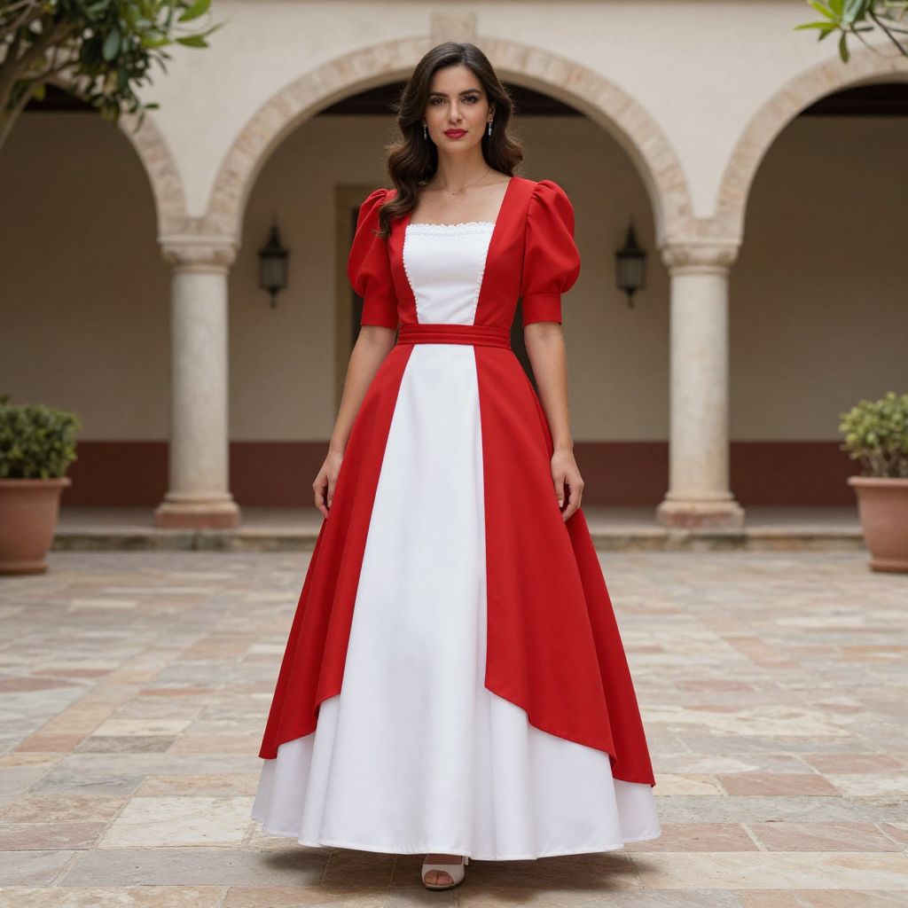 Photograph of a dark-haired woman with fair skin standing in a courtyard with stone-tiled floor and arched columns. She wears a full-length, white, A-line dress with puffy, short red sleeves and a red apron-like overlay. Her red lipstick matches the red of her sleeves and apron. She stands confidently with a slight smile, wearing red open-toe heels. Potted plants are placed on either side of the arched background, adding greenery to the scene. The overall style is elegant and vintage, reminiscent of classic fairytale aesthetics. The lighting is natural, highlighting the contrast between the red and white in her dress.