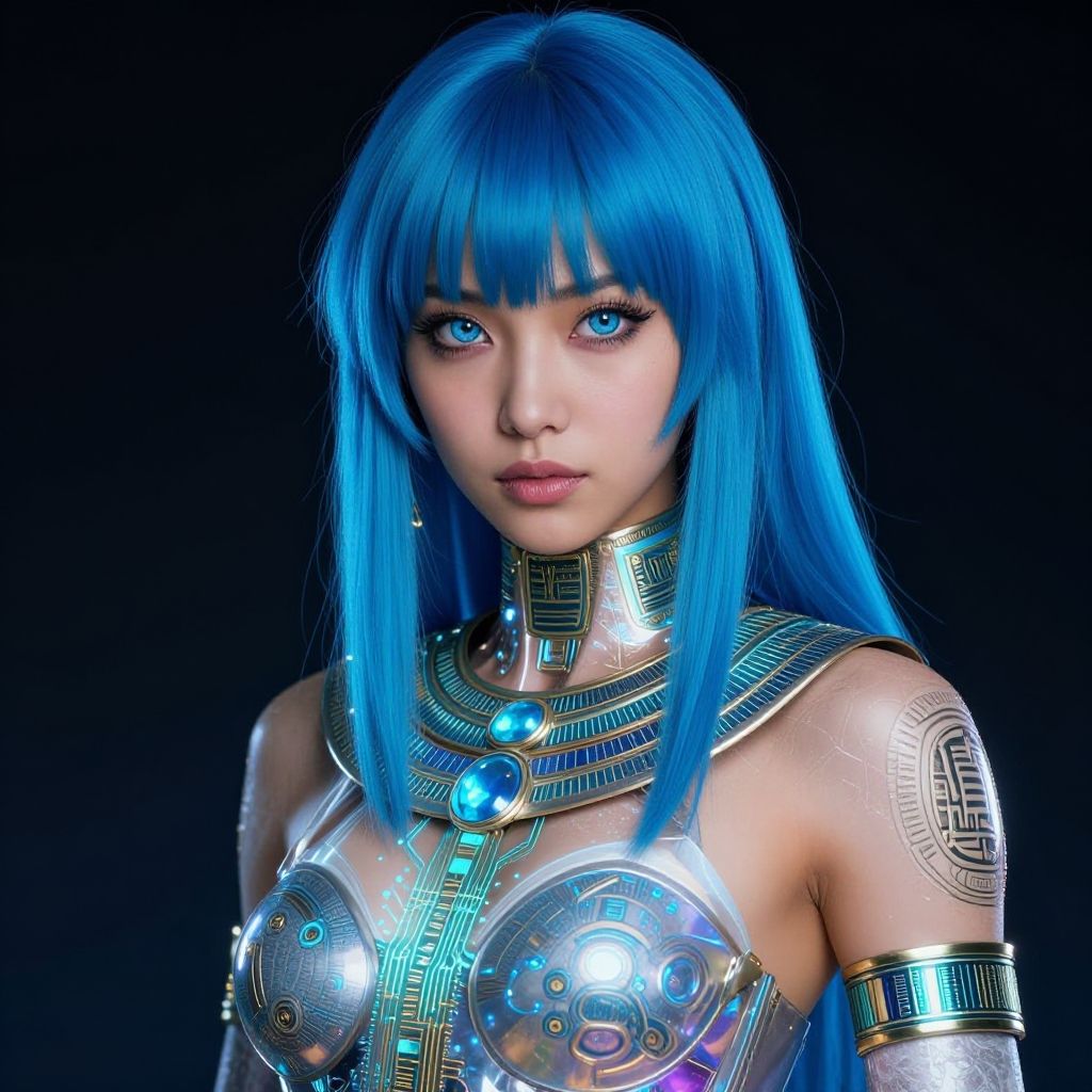 (high quality), (masterpiece), (detailed), 8K, Hyper-realistic digital illustration depicts (Japanese woman1.3) with (electric blue hair1.2) and (piercing blue eyes1.2), wearing (futuristic fantasy attire1.2) that combines (modern holographic accents1.2) with (ancient Egyptian hieroglyphic patterns1.2). Her (upper body1.2) is accentuated by (shimmering sapphire jewelry1.2) and (intricate, glowing circuitry1.2) that evoke a sense of technological mysticism. In style of Syd Mead, trending on Artstation.