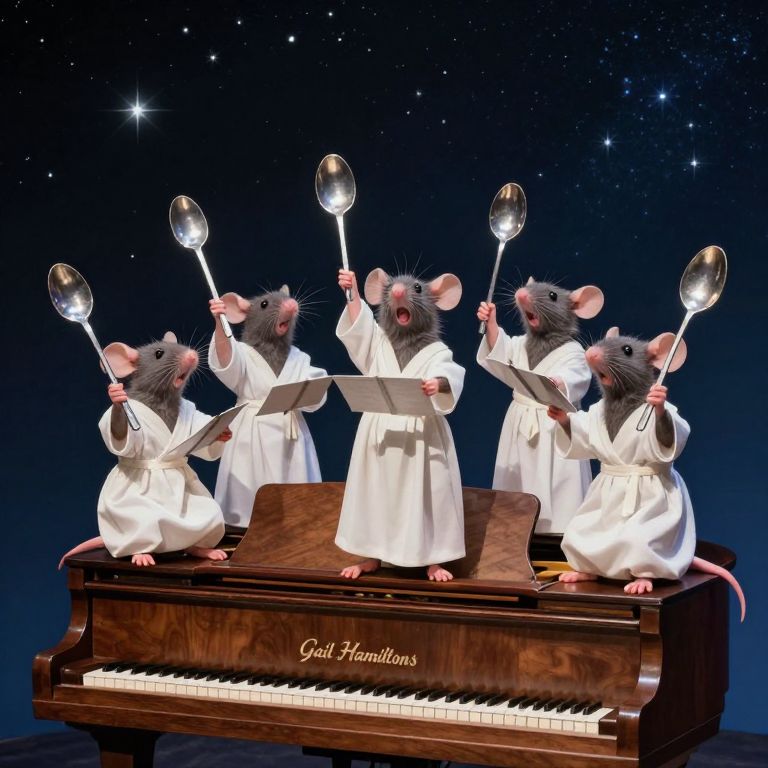 Five anthropomorphic mice, dressed in white robes and holding large silver spoons, stand joyfully atop a wooden grand piano labeled \"Gail Hamiltons,\" conducting an imaginary celestial orchestra against a starry night sky backdrop.
