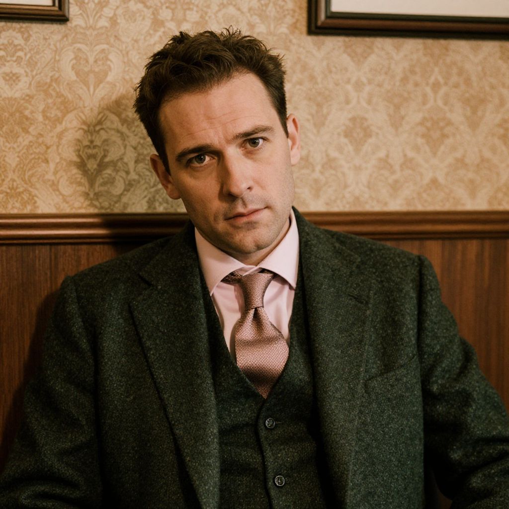 A man, dark green tweed suit, pale pink dress shirt, patterned silk tie, coordinating waistcoat, cozy lobby with patterned wallpaper, sepia effect, relaxed expression, warm ambiance. Man has masculine face and piercing eyes
