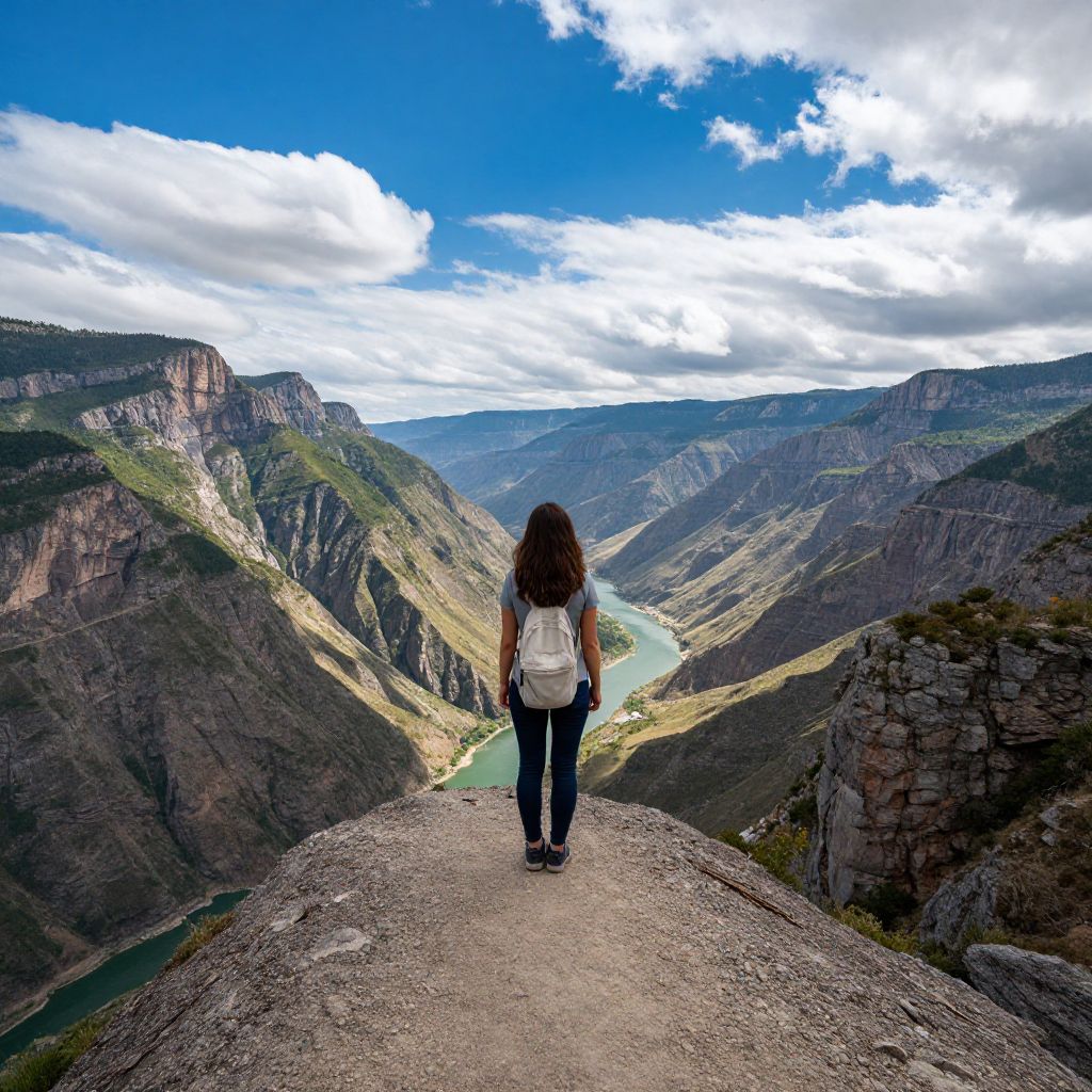Photograph of a woman with long dark hair, wearing a white backpack, black pants, and a dark top, standing on a rocky ledge with her back to the camera. She gazes at a vast, mountainous valley below, featuring steep, rugged cliffs, a winding green river, and lush greenery. The sky above is bright blue with scattered white clouds. The terrain is a mix of rocky outcrops and green hills. The scene conveys a sense of adventure and natural beauty.