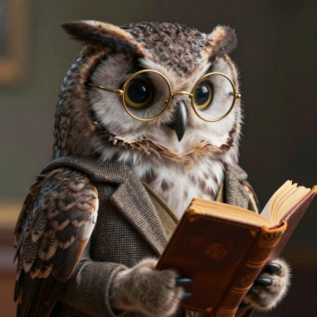 A 3D-rendered owl with steel gray with pale white accents feathers, wearing brass hammered round spectacles and a soft textured tweed jacket, holding an old leather-bound literature book. The owl has a serene, knowledgeable expression, with finely detailed feathers and realistic texture on the suit. The scene is illuminated with soft, ambient lighting to enhance the character's depth, showcasing intricate detailing on the glasses and the book’s cover. The overall style combines a blend of realism and charm, perfect for a distinguished, scholarly vibe.