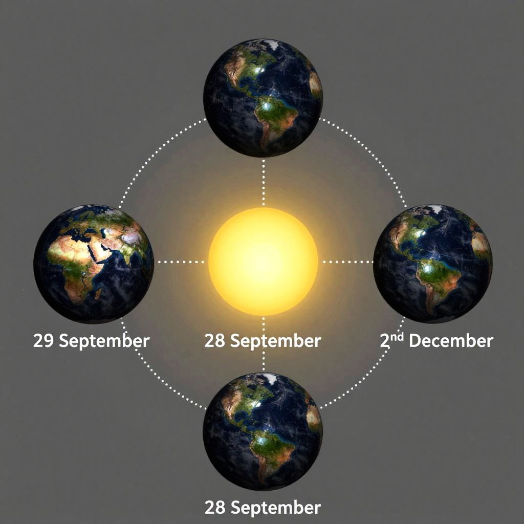 Photograph of Earths in three positions around a bright yellow sun, labeled 29 September, 28 September, 29 December, 28 September