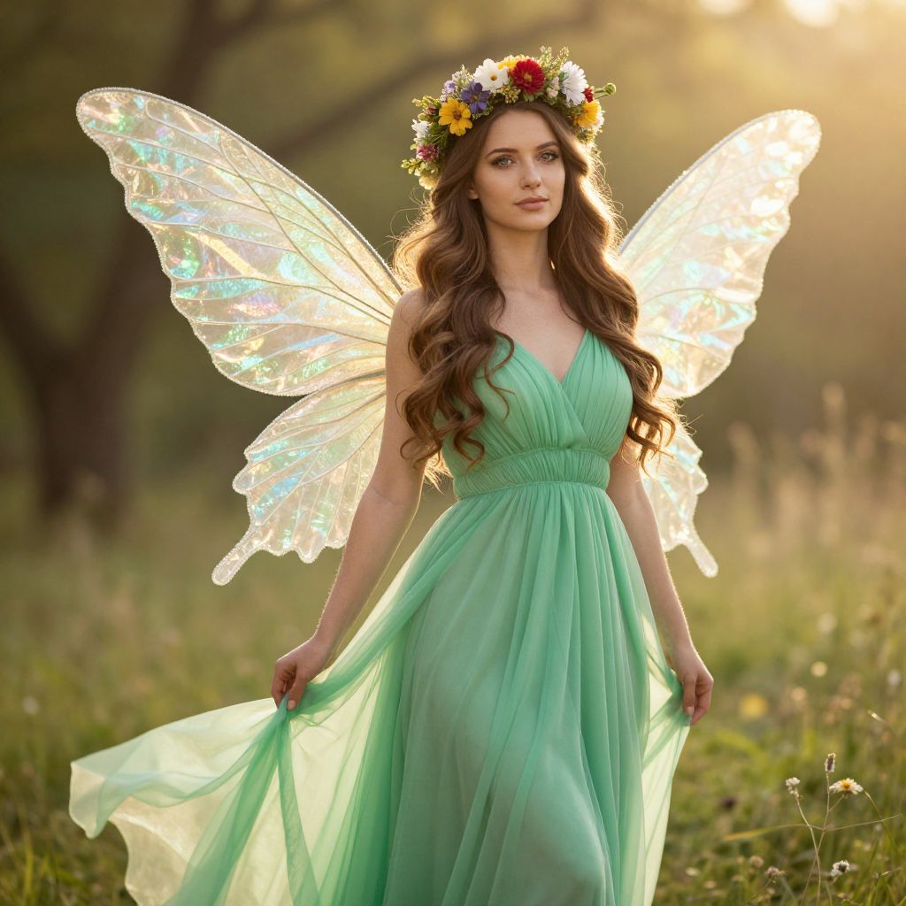 A beautiful woman with long, flowing brown hair, voluptuous curves, and big tits, wearing a sleek green dress that flows gracefully around her, with elegant, shimmering wings extending from her shoulders. The wings are made of soft, glowing fabric that catches the light, giving off a magical, ethereal glow. She stands confidently in a sun-drenched meadow, her eyes sparkling with charm and allure, exuding a sexy and powerful aura. The scene is dreamy and cinematic, with soft golden light filtering through the trees, enhancing her radiant presence.