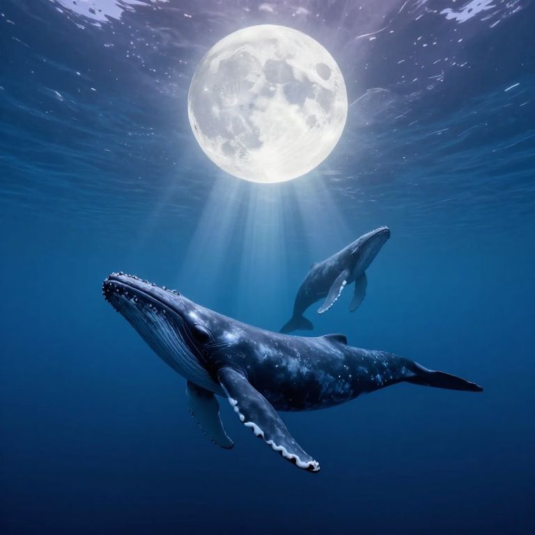 A serene digital artwork depicts a pod of humpback whales gracefully swimming beneath a luminous, glass-like moon that casts ethereal beams of light through the deep blue ocean, creating a harmonious interplay of natural beauty and celestial wonder.