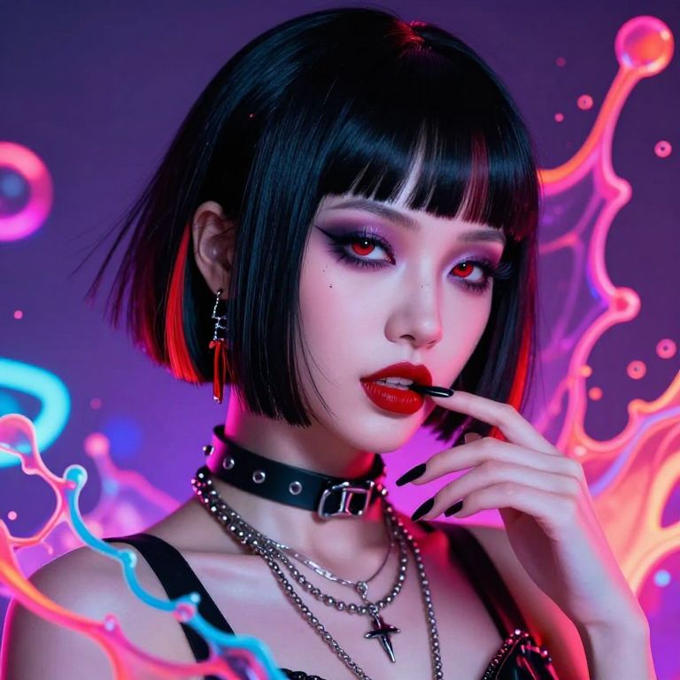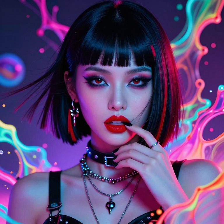 This vibrant digital artwork features a striking young Asian woman with a sleek, black bob haircut and blunt bangs. She has pale skin, bold red lipstick, and intense, dark eyeliner accentuating her eyes. She wears a black leather choker, multiple silver chains, and a black strap top. Her left hand, with black-painted nails, touches her lips. The background is a colorful, abstract swirl of neon pink, blue, and purple hues, creating a futuristic, cyberpunk atmosphere. The overall style is highly stylized and dramatic, with a focus on vivid colors and edgy fashion elements.