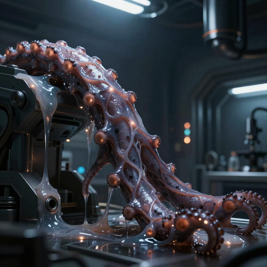 Biomechanical slime tentacle with glowing veins, slime dripping off metallic surfaces, dark futuristic lab setting, bio-organic textures, cyberpunk aesthetic, intense moody lighting