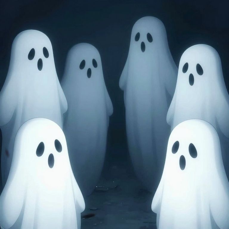 Photograph of glowing white ghost figures with black eye holes, standing in a dark blue background, illuminated from below. Five ghosts, varying sizes, create