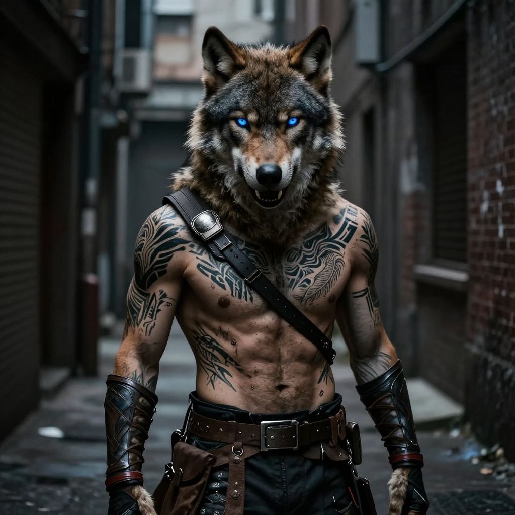 Photorealistic digital art of a muscular, tattooed anthropomorphic wolf with glowing blue eyes, standing in a dark, narrow alley.