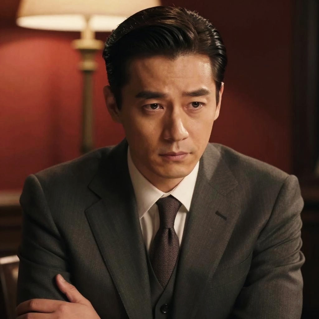 This is a photograph of a handsome man with slicked-back dark hair, wearing a dark grey suit, white shirt, and patterned tie. He has a serious expression and is slightly leaning forward with his hands crossed. The background is blurred with a warm, red glow and a soft-lit lamp, giving a dramatic, moody atmosphere. His skin is fair, and he has well-groomed eyebrows.