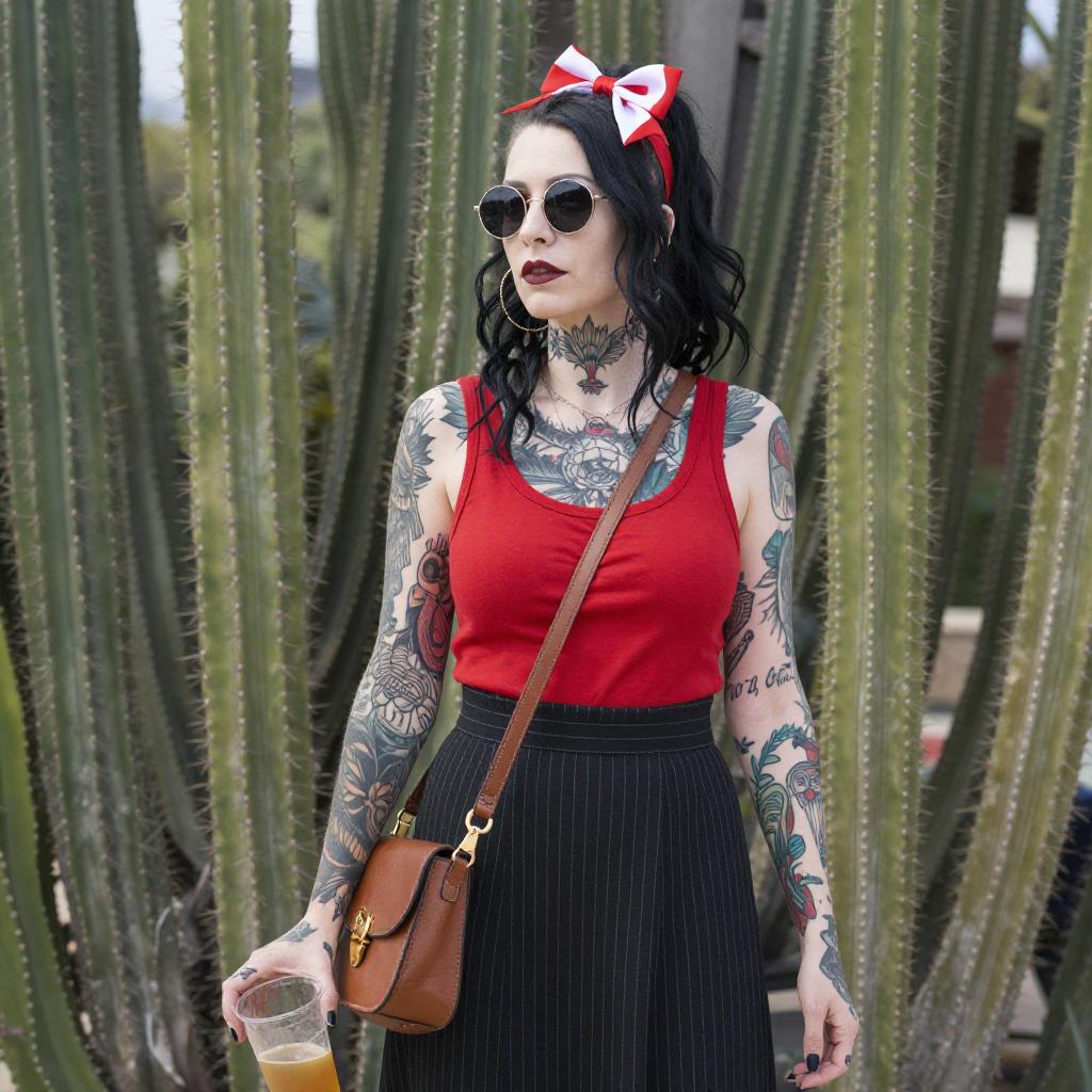Photograph of a heavily tattooed woman with pale skin and dark hair, wearing a red sleeveless top, black pinstriped skirt, and a brown crossbody bag. She has a red and white bow in her hair, round sunglasses, and is holding a clear drink. She stands in front of green, cactus-like plants in a natural setting.