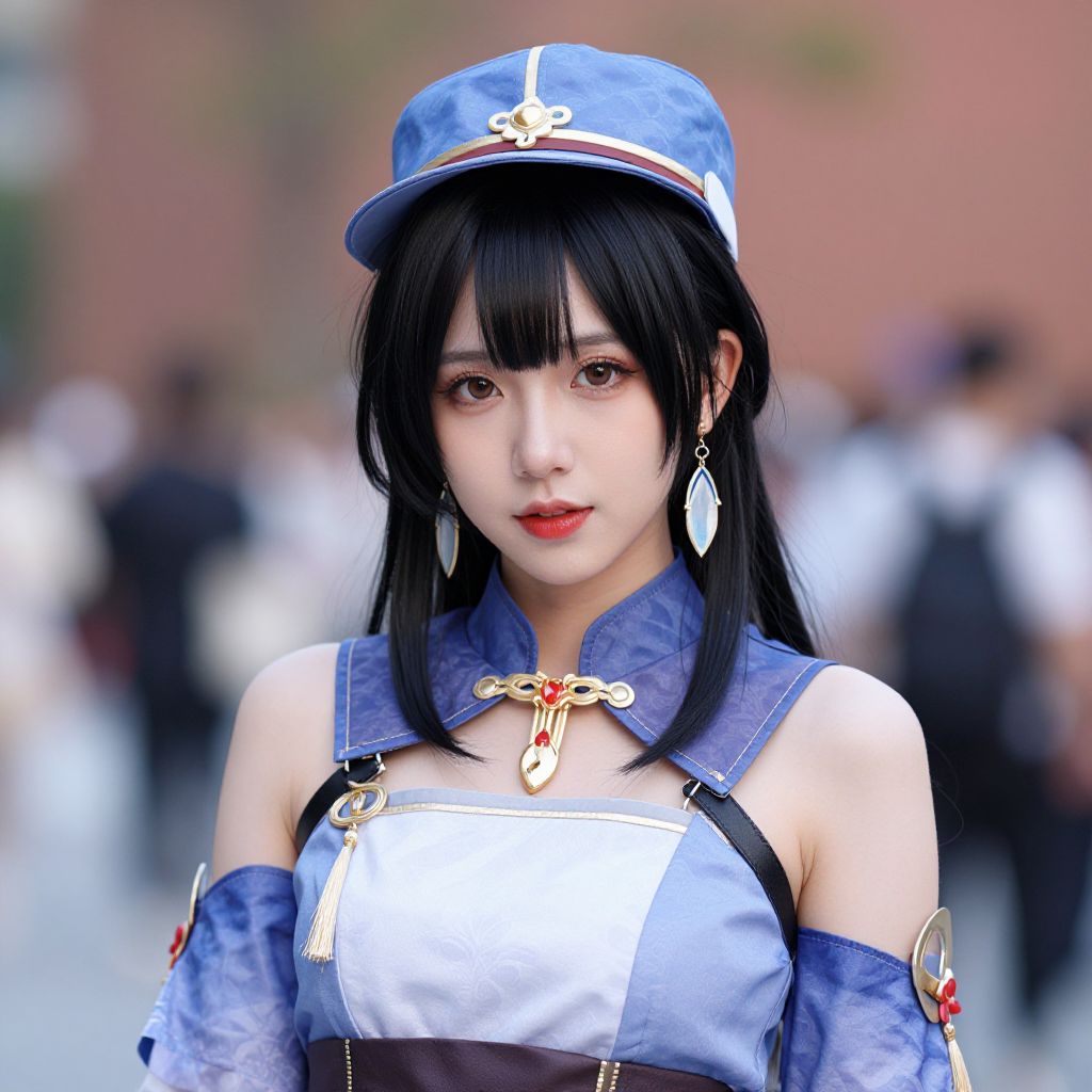 Photograph of an East Asian woman with long black hair, wearing an elaborate black and gold cosplay outfit, adorned with golden horns and red tassels