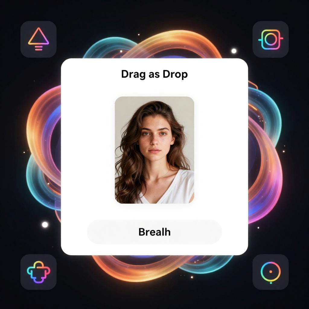 A digital user interface design for an AI art generator featuring a drag-and-drop photo input area displaying a portrait of a young woman with long brown hair and a white top. The interface is set against a dark mode background with swirling colorful abstract effects symbolizing creativity and machine learning. Surrounding the input area are AI-inspired icons with gradient colors, emphasizing the theme of artificial intelligence and digital artistry.