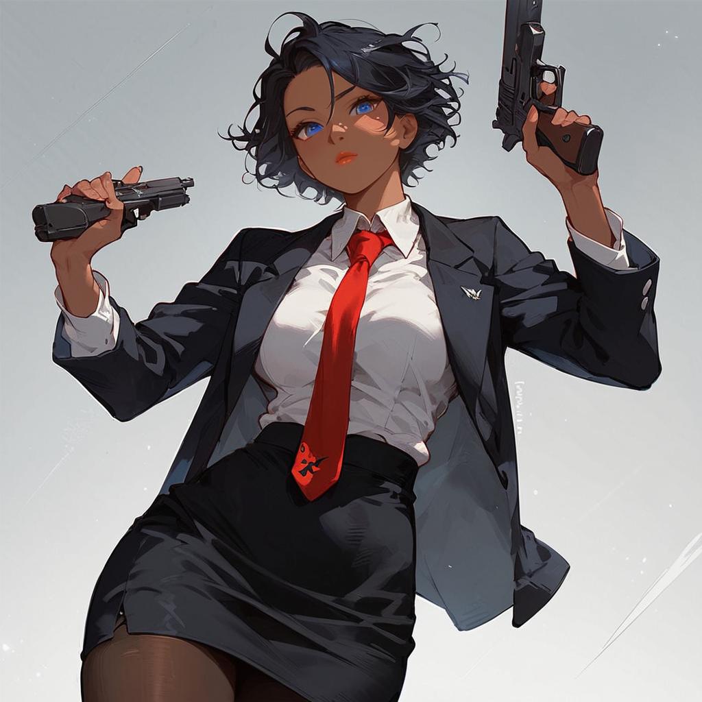 Score_9, score_8_up, score_7_up, score_6_up, score_5_up, score_4_up, source_anime, 1girl, solo, rally vincent, black hair, blue eyes, dark skinned female, short hair, business suit, pencil skirt, pantyhose, portrait, holding gun, gun, handgun, red tie, black jacket, black skirt