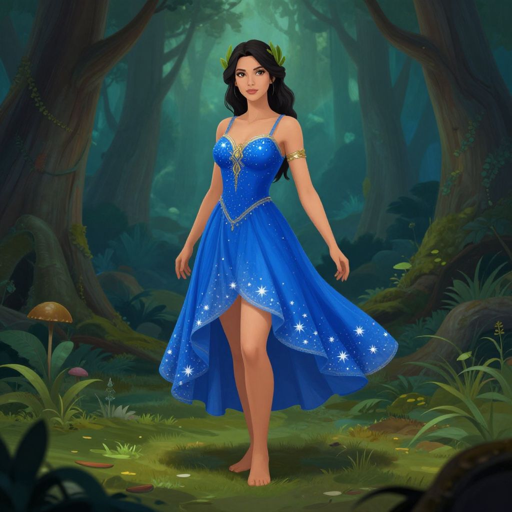 A barefoot woman stands gracefully in a mystical forest clearing, wearing a vibrant blue dress adorned with white star patterns and gold accents. Her dark hair is decorated with green leaves, blending harmoniously with the enchanting woodland background, depicted in a detailed digital fantasy art style.