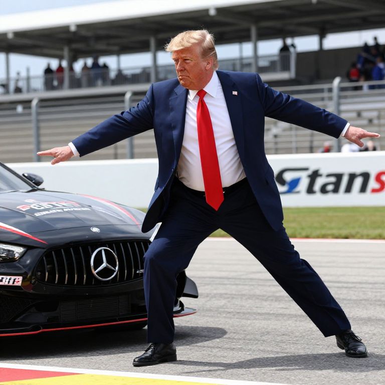 Devotion real photograph of Donald Trump neir automota as he clumsily staggers around Daytona Raceway,