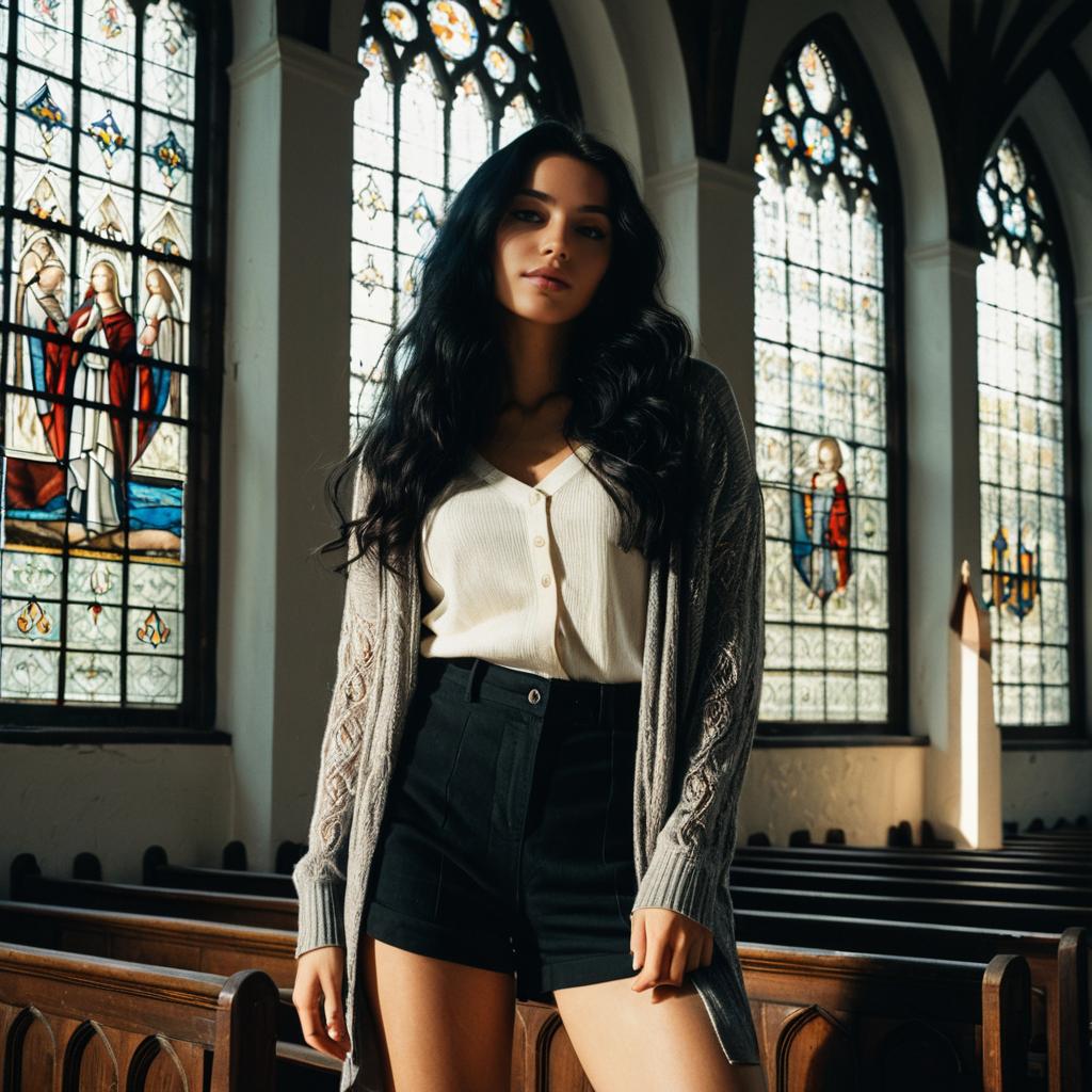 A stunning woman with long wavy black hair, soft makeup, full lips, and smooth skin, framed by stained glass windows in an old chapel, wearing a sheer polka dot blouse tucked into a mini skirt, warm natural light casting soft shadows.