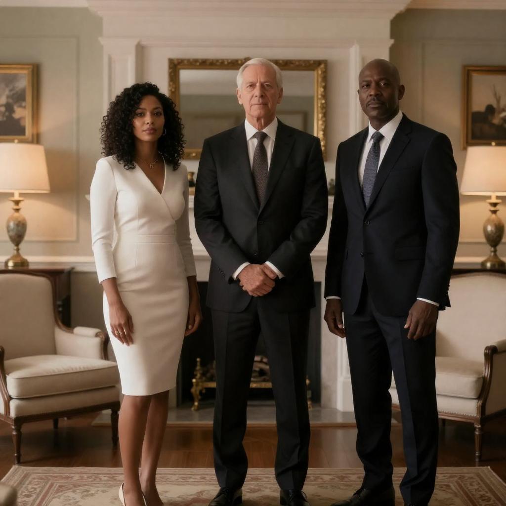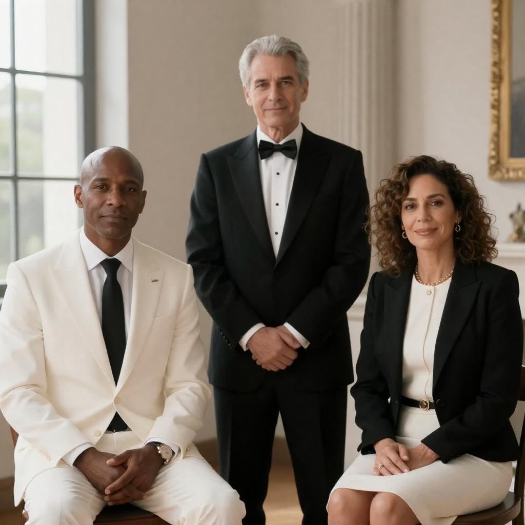 Photograph of three people in formal attire. A bald man in a white suit with a black tie sits left, a middle-aged man with gray hair in a black tuxedo stands center, and a woman with curly brown hair in a black and white outfit sits right. They are in a room with a carved stone column and a window in the background.