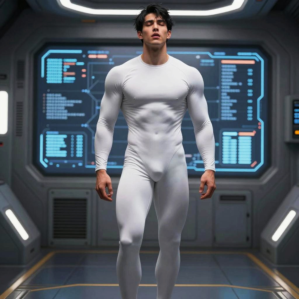 ((masterpiece)), ((best quality:1.2)), High Resolution, 8k, (ultra_realistic:1.3), (photorealistic:1.4), sharp focus, highly detailed, yaoi, ((1boy)), an attractive Caucasian fit muscular male, perfect handsome young toned male, ((long_sleeve_pants thin pure white_compression bodysuit:1.4)), messy short black hair, ( walking in the space ship, separated legs, open mouth, closed eyes), (circle light bar, futuristic spaceship LCD background), detailed skin texture, ((handsome clean shaved face)), shiny white skin, (broad shoulders), ((detailed muscular biceps and triceps:1.3)), (muscular thighs), long toned legs, toned abdomen, narrow waist, hip bones, crotch, from above view, full shot, cinematic, crystal clear, (global illumination), (subsurface scattering), (area light, soft light)