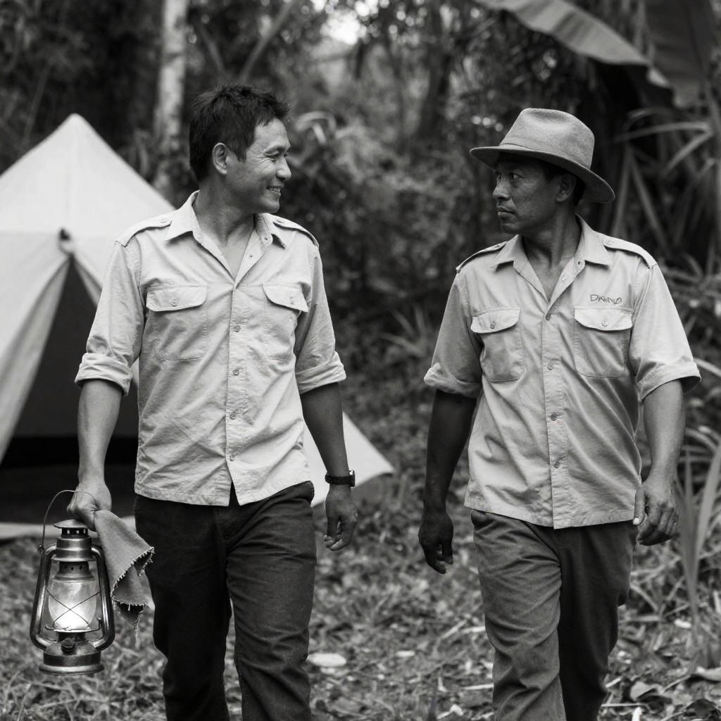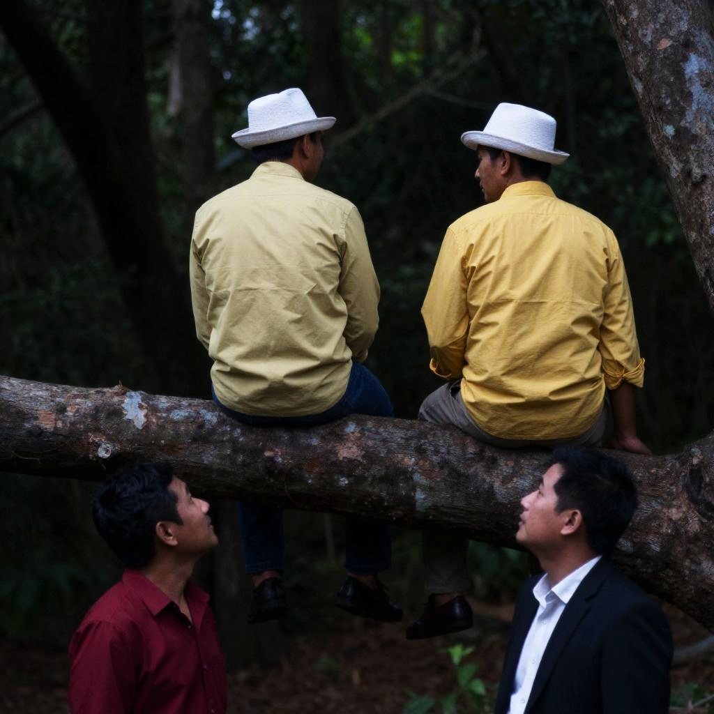 Photograph of a forest scene. Two men with short dark hair sit on a large tree branch, wearing white hats and yellow shirts. Two other men with similar dark hair, one in a red shirt and one in a black suit with white shirt, stand below, looking up. Dark forest background with dense trees.