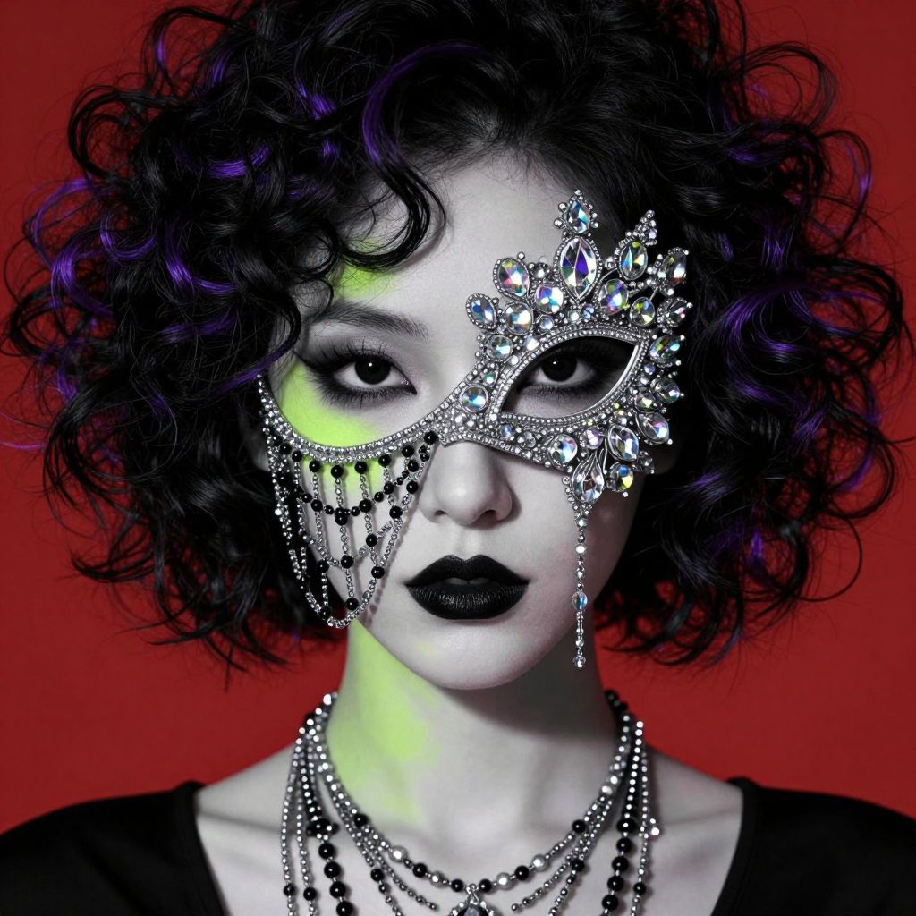 Hyper-realistic close-up digital illustration of a striking woman with pale skin accented by subtle hints of lime green, her sharp, expressionless face confronting the viewer directly, Her short, extremely curly black hair is infused with violet accents, forming a halo of vibrant texture around her face, Her perfectly black eyes are mesmerizing and enigmatic, piercing straight through the viewer, The right side of her face is adorned with an intricately designed silver mask featuring a symmetrical floral pattern, encrusted with sparkling crystals that catch and refract light in dazzling brilliance, She wears an avant-garde black top, paired with a dramatic chain necklace that drapes over her face, made of small, glossy black beads arranged in a grid-like design, partially obscuring her eyes and nose, The crimson red background intensifies the scene, contrasting vividly with the monochrome elements and lime green accents, while soft, focused lighting highlights her face and the reflective intricacy of the crystals and beads, Captured with a 35mm lens at f/1, 4, this 8K masterpiece emphasizes bold contrast, stunning detail, and a hauntingly elegant avant-garde aesthetic