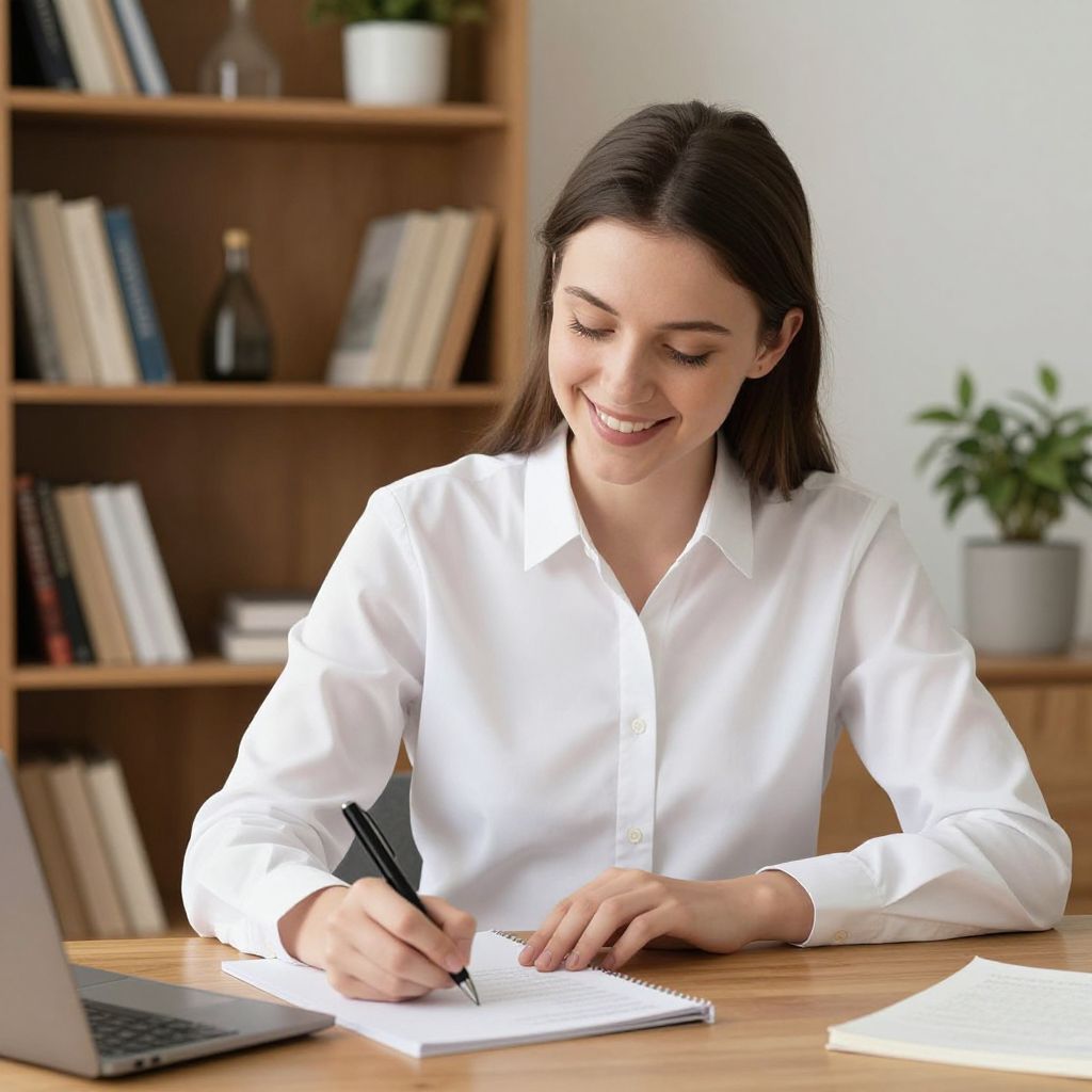 Smiling woman seated at a wooden desk, wearing a crisp white button-up shirt, writes on a pad of paper with a black pen while surrounded by a cozy bookshelf filled with books, decorative items, and potted plants in the background.