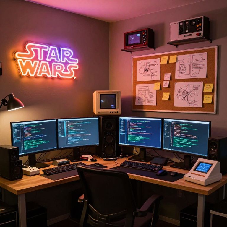 Nerdy room showcasing an elaborate Star Wars collection, multiple computer screens with programming code, retro video game consoles, glowing neon signs, a corkboard filled with sticky notes and schematics, warm ambient lighting.