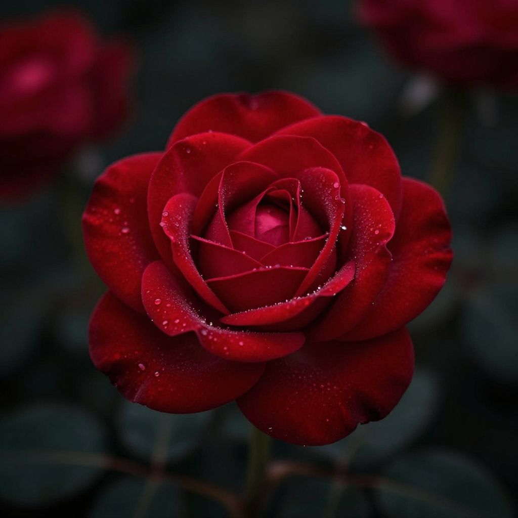 Red rose aesthetic wallpaper featuring a close-up of blooming red roses with soft petals and dew drops, set against a dark, moody blurred background, emphasizing elegance and romantic vibes, perfect for a serene and stylish digital backdrop.
