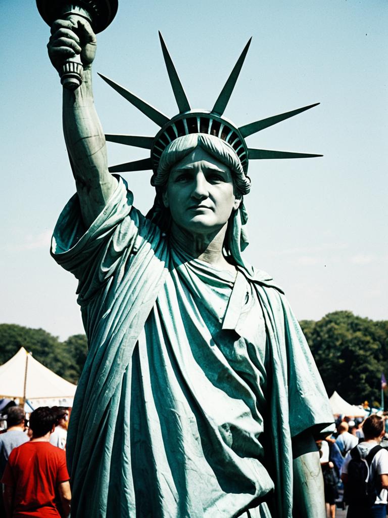 Man in Statue of Liberty Costume, candid portrait at festival, natural daylight