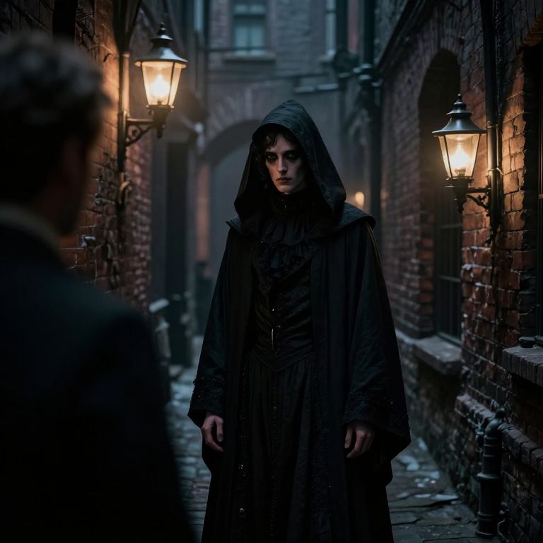 Envision a captivating fusion of dark fantasy and neo-victorian aesthetics, portraying an unsettling portrait of a robed figure in the shadowy depths of a dimly lit alleyway. From an unnerving over-the-shoulder viewpoint, the viewer is confronted by the enigmatic character, their eyes revealing a profound, unsettling wisdom. The background is bathed only in the faint glow of flickering gas lamps, casting elongated shadows that playfully dance across the crumbling brick facades. This thought-provoking composition harmoniously blends Victorian refinement with brooding fantasy elements, instilling an air of mystery and intrigue as our cloaked figure stands at the precipice between two distinct realms.