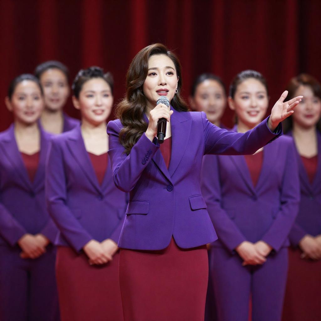 Photograph of a female singer in a purple suit and red dress, holding a microphone, gesturing to the right. Five women in matching purple suits and red dresses stand behind her, smiling. Red curtain background. Singer has wavy brown hair.