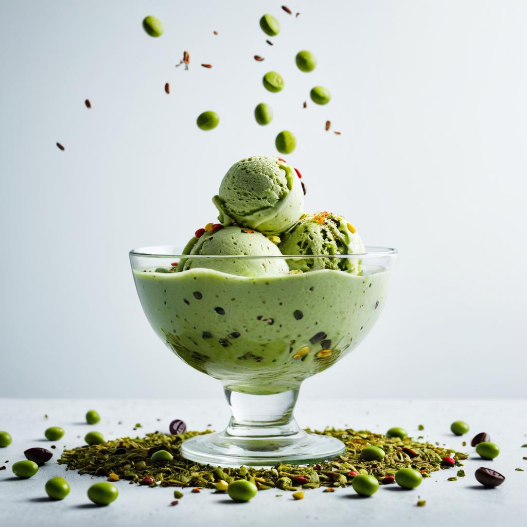 Mint chocolate chip ice cream, with chopped Reese's Pieces floating in air, soft candlelight glow, vintage metal ice cream scoop hovering, ultra-realistic advertising photography, 8K