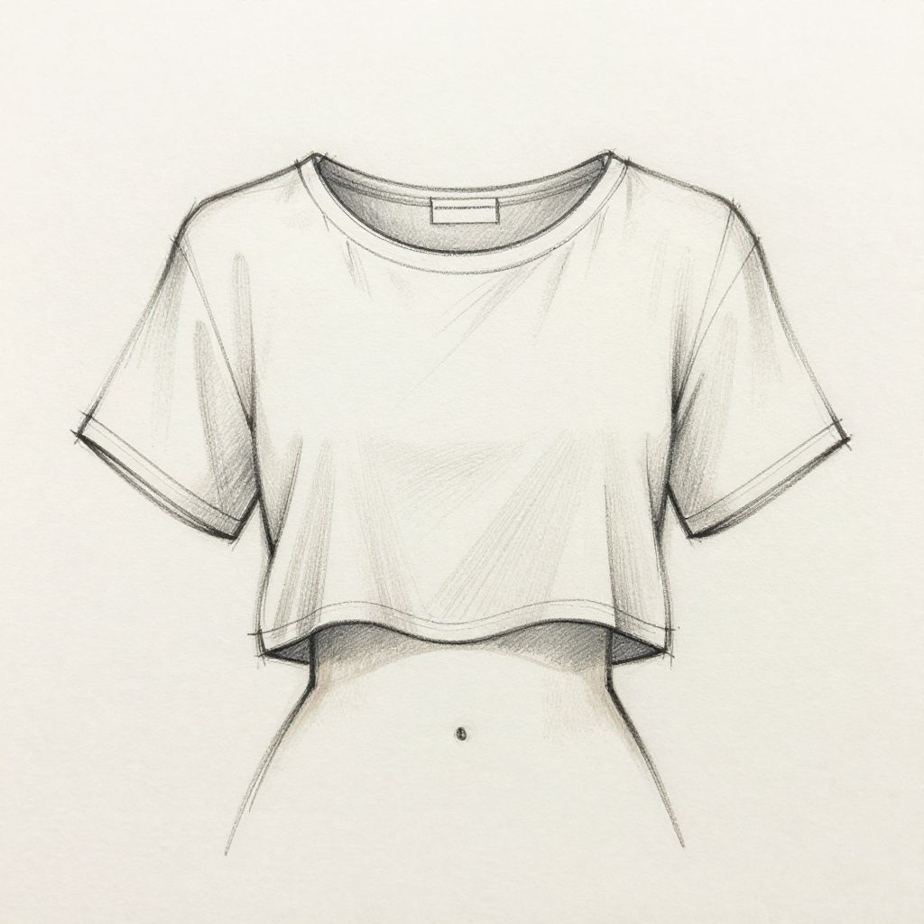 Crop top sketch depicting a casual summer outfit on a figure, light and airy pencil sketch with loose lines and soft shading, attention to fabric flow and neckline details, minimalist approach creating an elegant fashion illustration