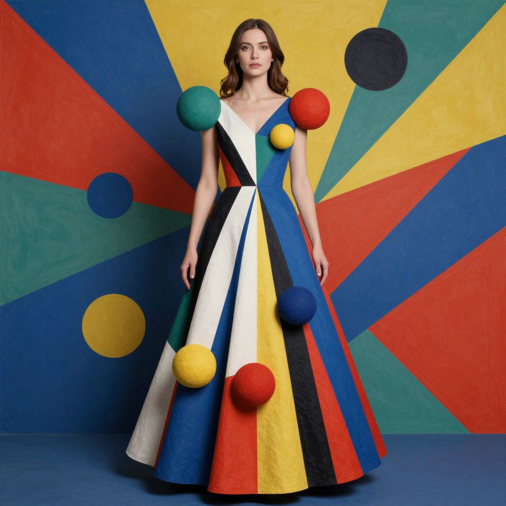 A woman in a geometric gown with colorful spheres and abstract shapes, reminiscent of Vassily Kandinsky's style, stands against a vibrant, geometric background.