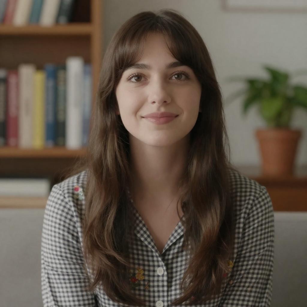 Photograph of a woman with long, wavy brown hair, smiling slightly, wearing an orange knit sweater, resting her chin on her hand. She has a green ring on her right hand. Background includes a blue and green wall.