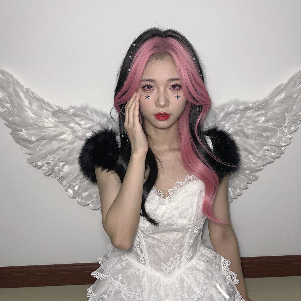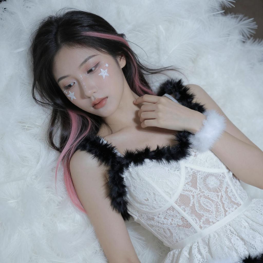 Photograph of an Asian woman with black hair and pink highlights, wearing a white lace lingerie top, black fur-trimmed jacket, and white feathered headpiece. Her face is painted with white geometric patterns. She gazes downward, hands gently touching her jacket. Bright, overexposed lighting creates a glowing effect.
